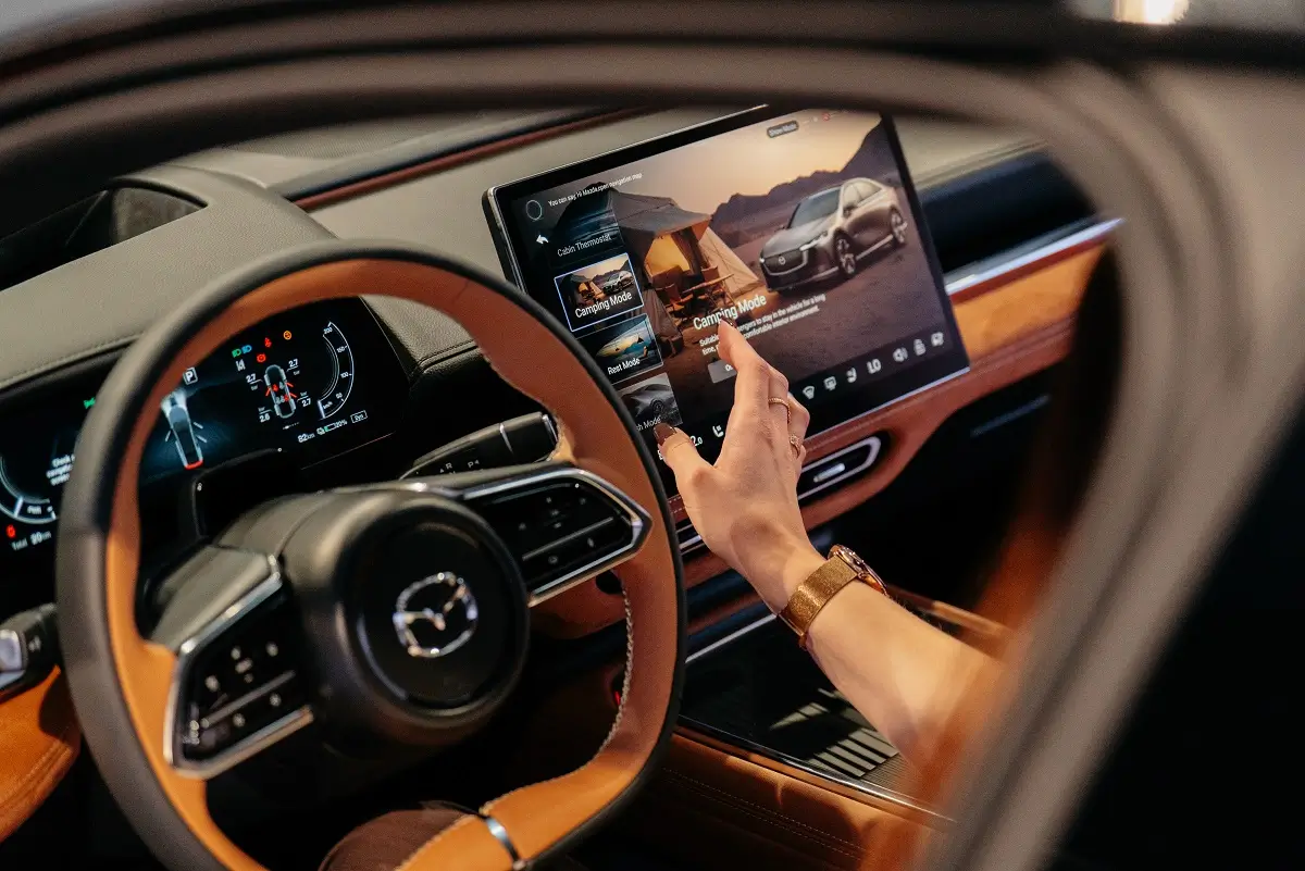 Mazda6e salonā dominē japāņu dizaina princips Ma – telpas skaistums starp elementiem. Panorāmas stikla jumts, trīs salona apdares varianti, 14 skaļruņu Sony premium klases audio sistēma un bezvadu Apple CarPlay un Android Auto nodrošina patiesu komfortu. Ar Mazda6e lietotni iespējams attālināti kontrolēt uzlādi, klimatu, durvis un pat dalīties ar digitālo atslēgu.